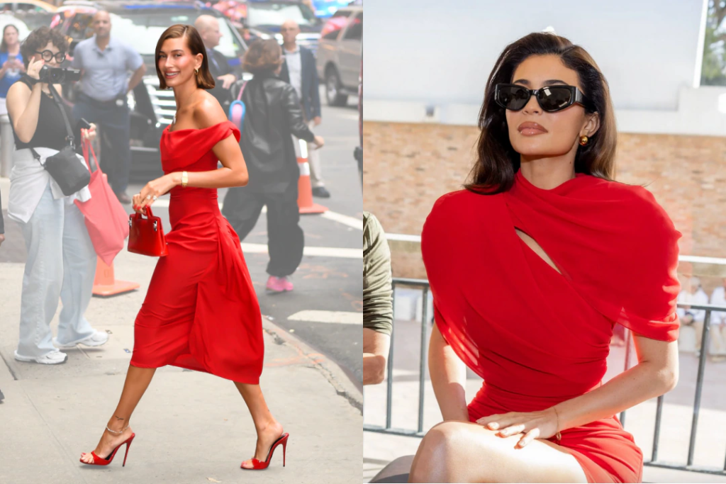Kylie Jenner and Hailey Bieber have both embraced the power of monochrome, proving that head-to-toe red is a foolproof fashion moment. Hailey elevated her look with a Ferragamo bag and matching red Jimmy Choo heels, leaning into a polished, directional finish. Kylie, on the other hand, offset her dress with chunky gold jewelry and statement sunglasses, bringing a sense of attitude and contrast.