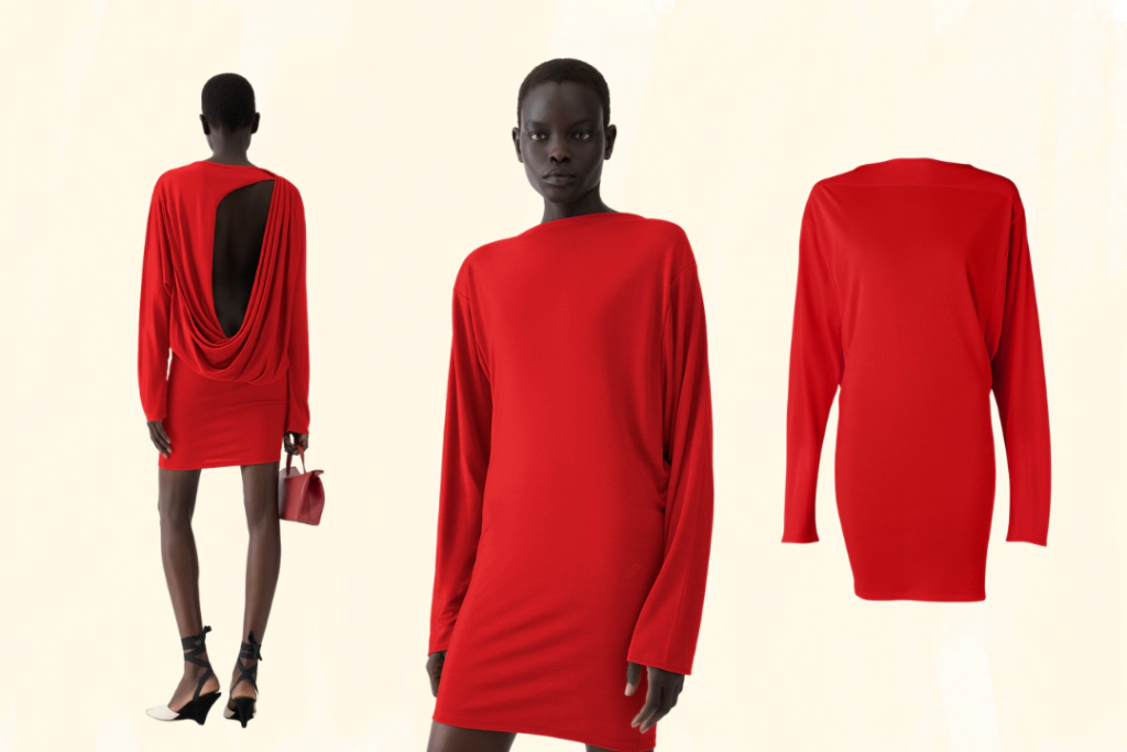 The benchmark for this season’s red dress is undeniably Jacquemus’ The Mistral Dress, first seen on the runway and later immortalized by Kylie Jenner. Cut in a fluid viscose jersey, the mini dress balances sensuality with restraint. A boat neckline and fitted sleeves frame the upper body, while round embroidery at the front introduces subtle texture. The back reveals a carefully placed cut-out and a swooping draped panel that moves with elegance rather than drama. With its fitted shape, mini length, and thoughtful detailing—crafted from 83% viscose and 17% polyamide and made in Portugal—The Mistral exemplifies Jacquemus’ ability to make simplicity feel modern.