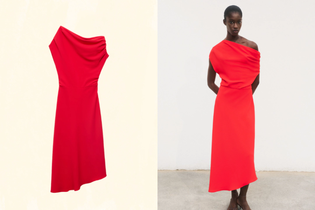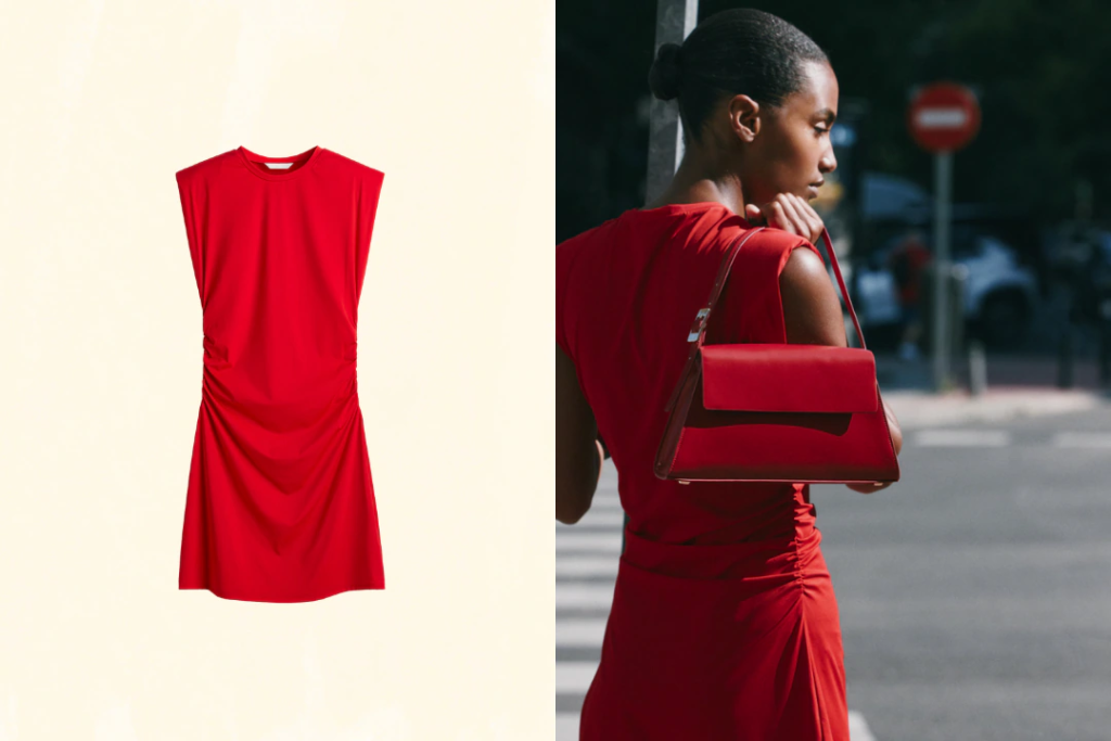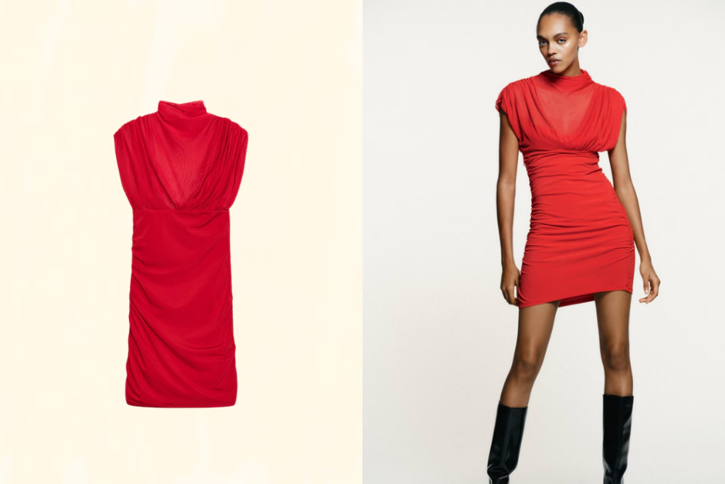 Mango’s Asymmetrical Midi-Dress takes a more elegant approach, featuring an A-line shape, gathered shoulder detail, and an asymmetrical neckline designed for formal holiday events. Zara’s Short Mesh Dress leans into texture, using soft mesh and strategic draping along the sides to create movement and dimension in a sleeveless, high-neck silhouette. Each echoes the ruched sexy appeal of the original while standing confidently on its own.