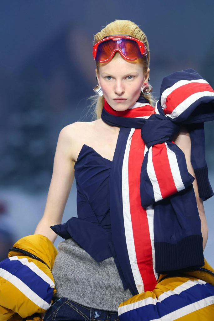 Guests received invitations designed like ski passes, then watched a runway staged as a snowy slope—more mountain fantasy than literal weather report. The setting made the point immediately: this wasn’t about cozy layering. This was about performance, speed, and turning cold-weather gear into a look with bite.